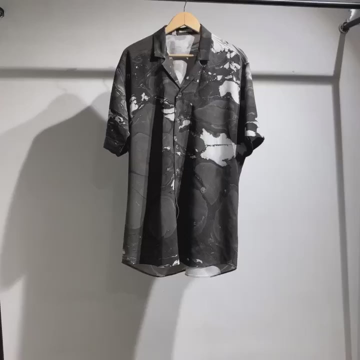 Step into a world of striking contrasts with our Cuban Collar Shirt - San La Muerte. This shirt features a bold and mysterious color palette of black, grey, and white, all intricately hand-marbled to create a unique and captivating design. Perfect for those who appreciate the beauty of darkness and elegance in their wardrobe.