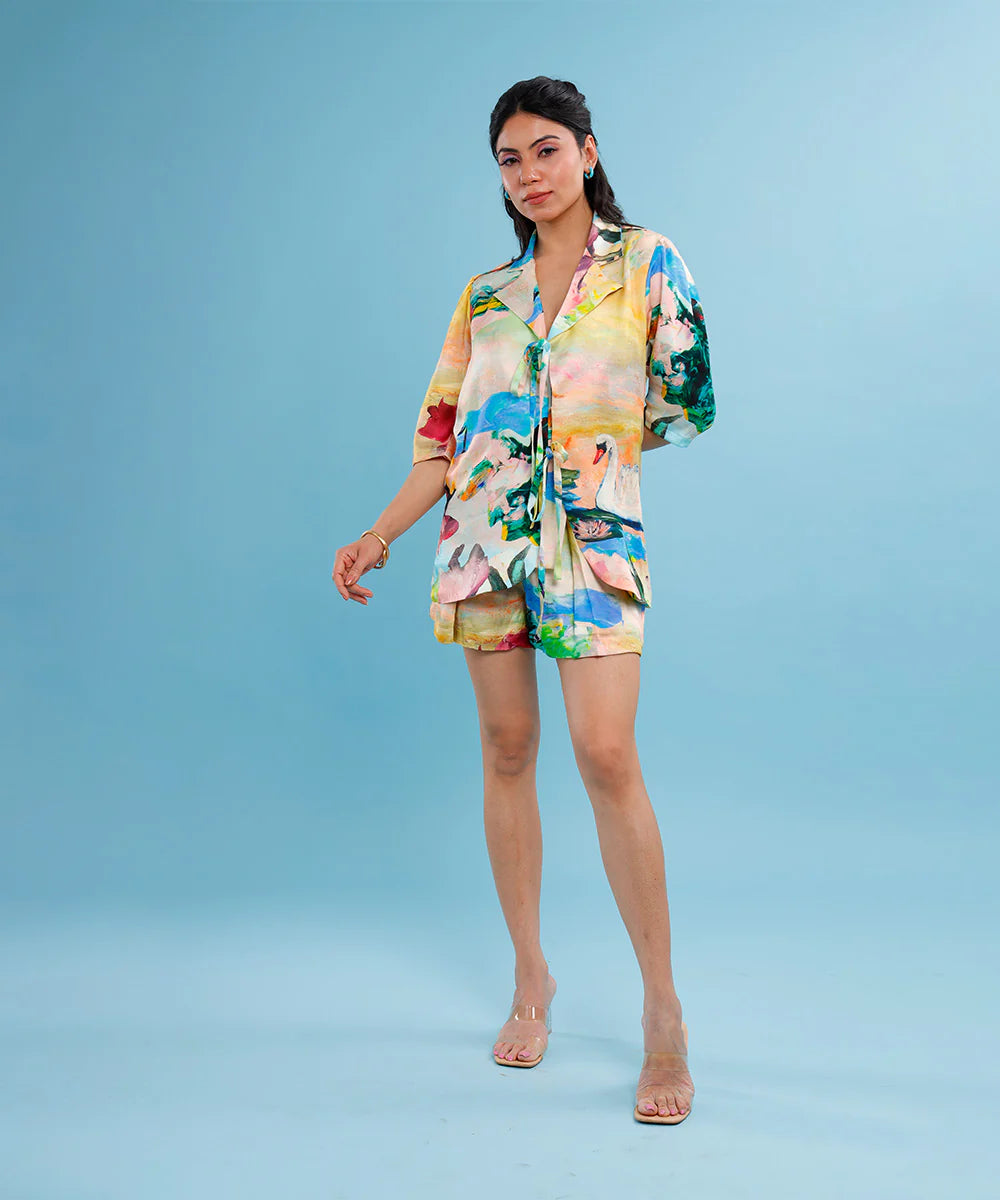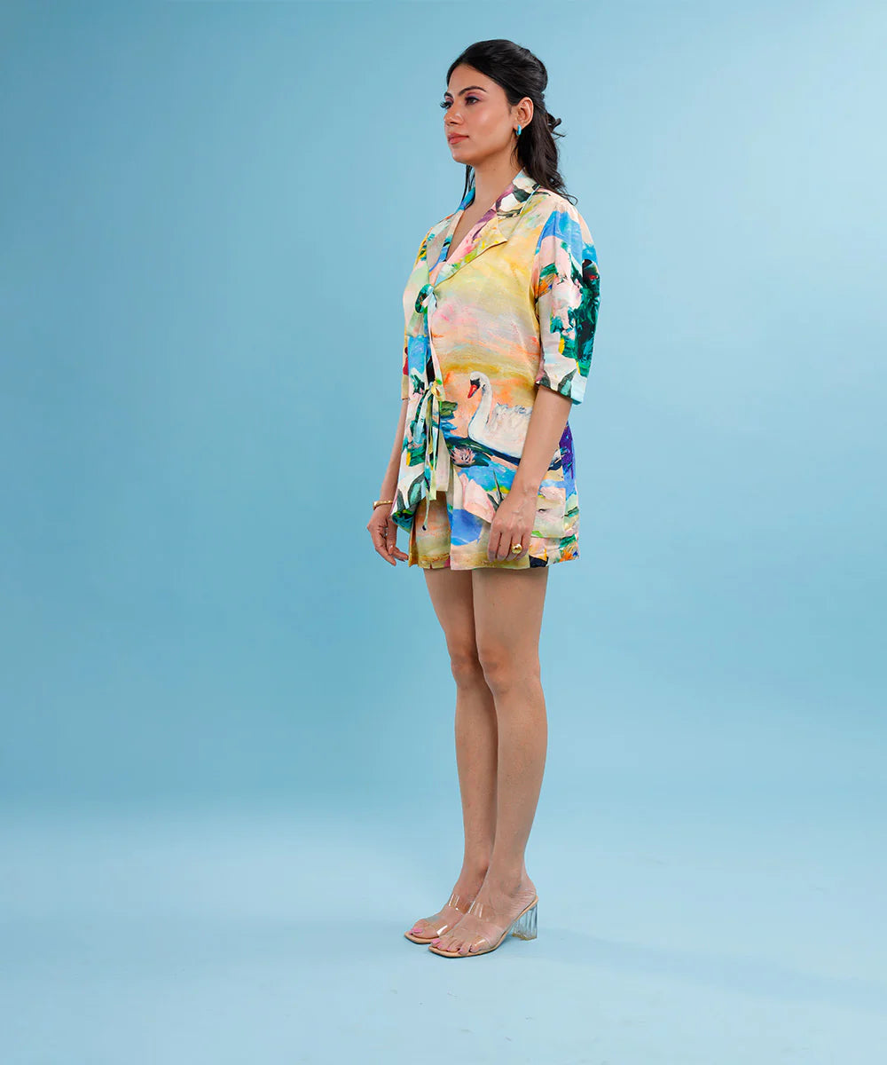 A printed tie-up shirt for a playful twist, paired with shorts to keep it cool and comfy.